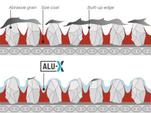 Uobičajeno je da se kod konvencionalnih abraziva aluminijum lijepi za vrhove zrna, što uzrokuje zapušavanje abraziva. Međutim, s dodatnim slojem VSM ALU-X, adhezija se značajno smanjuje, omogućavajući bržu i dugotrajniju upotrebu abraziva.